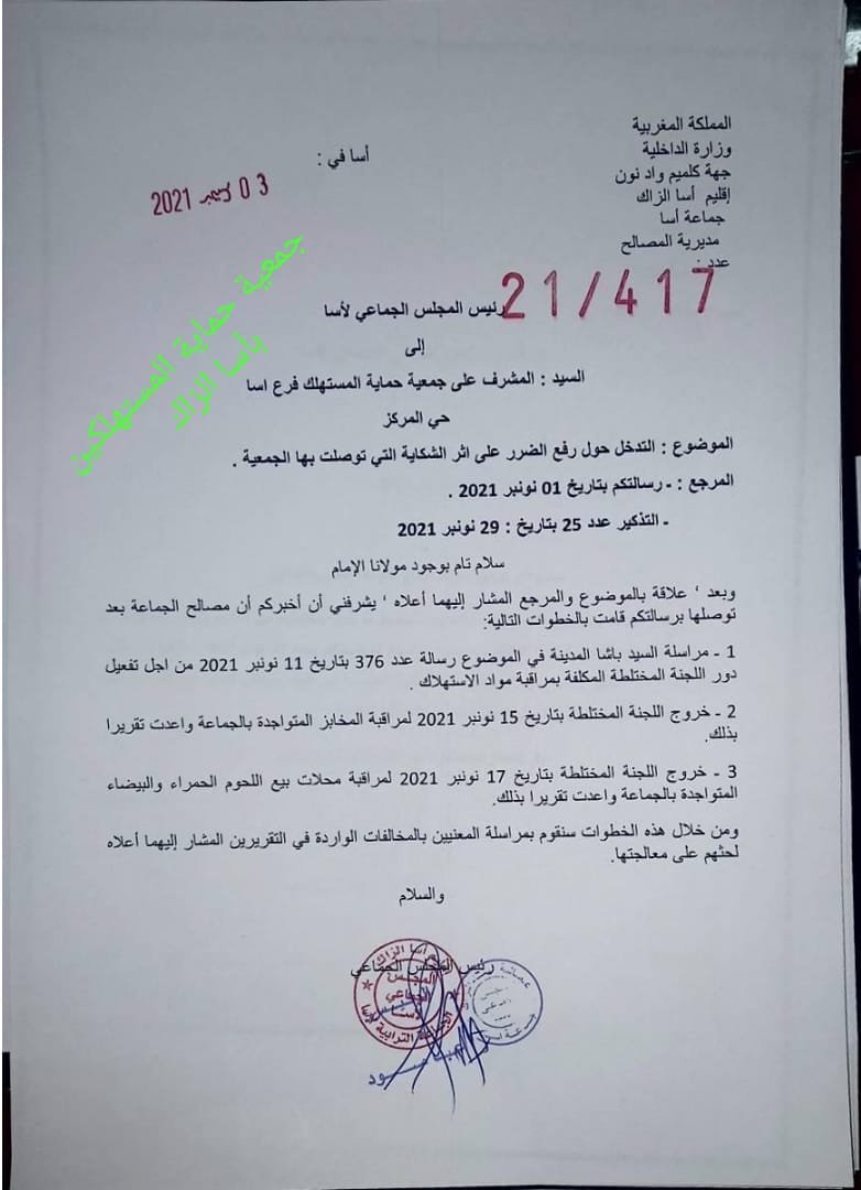 تجدد مراسلة كل من رئيس المجلس الجماعي بأسا و عامل إقليم أسا الزاك بتذكير حول مآل مراسلة الجمعية التي لم تتلقى أي رد من الجهات المعنية