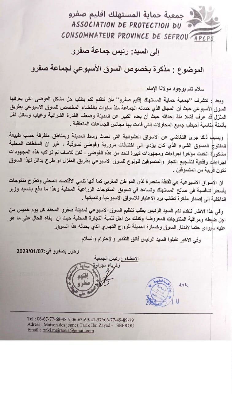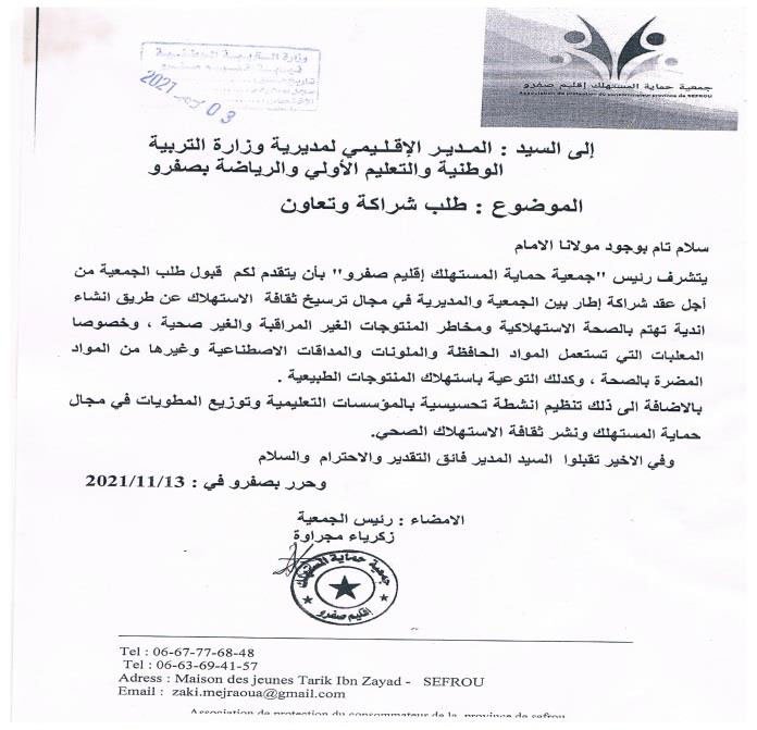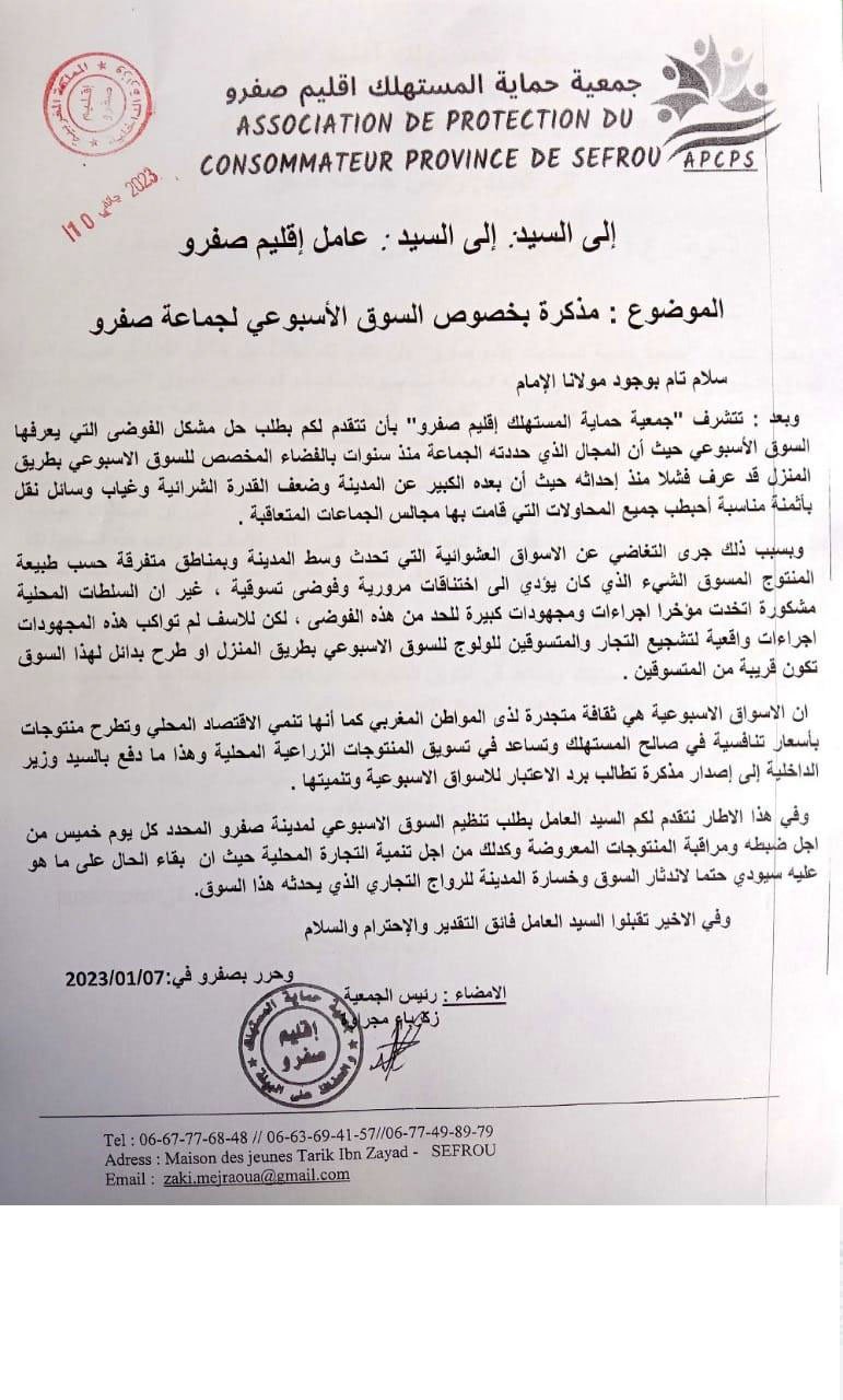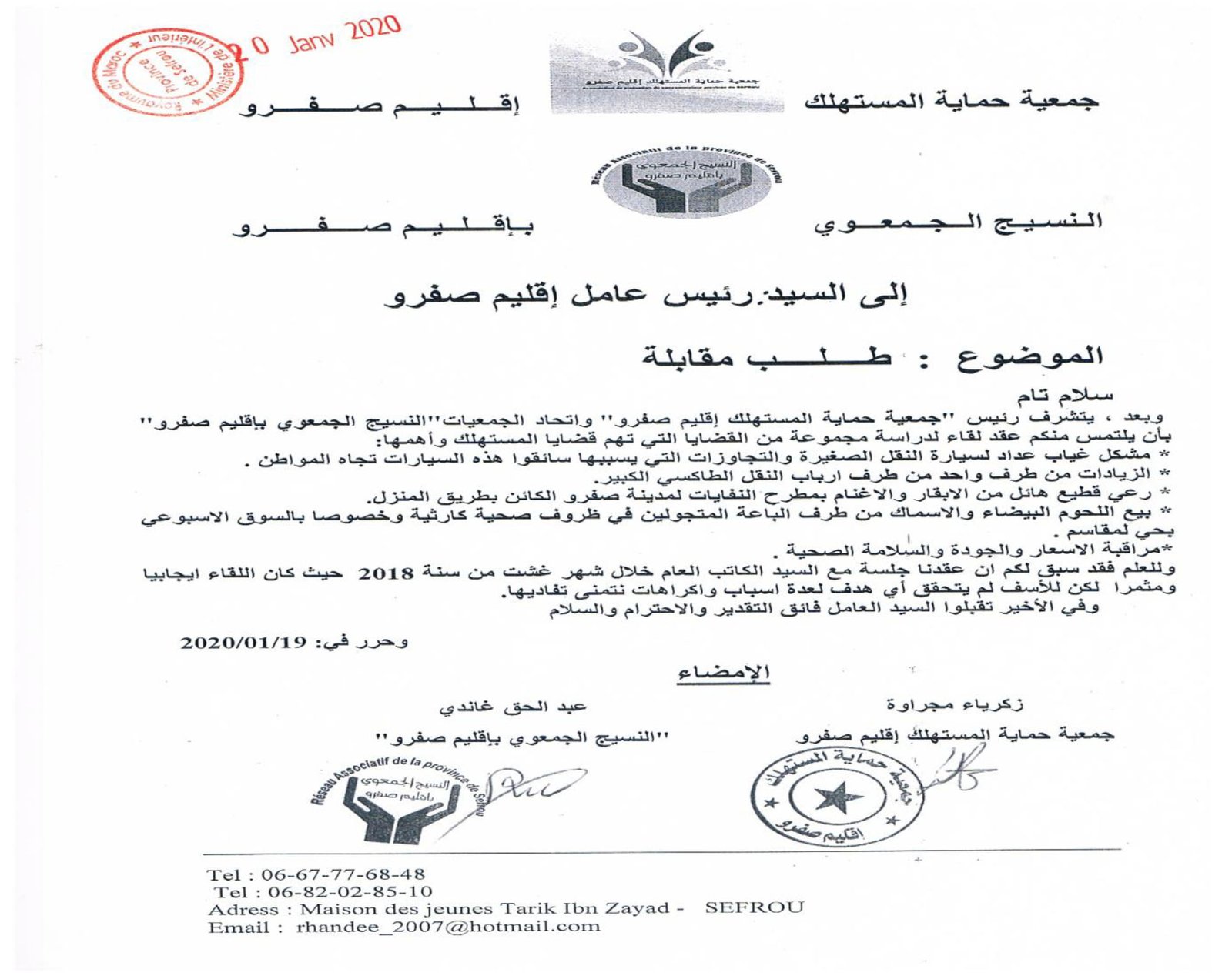 عقدت الجمعية عقدة لقاءات مع السادة عمال الاقليم والكتاب العامون وباشوات المدينة وبعض رؤساء الجماعات الترابية المتعاقبين ورئيس القسم الاقتصادي بعمالة اقليم صفرو حول عدة مواضيع تهم حماية المستهلك وعلى راسها مشكل الدقيق المدعم وعداد سيارات الاجرة وتجاوزات سيارة الاجرة الكبيرة وجودة منتوجات المخابر ونقص وزن الخبز والمخابز التقليدية الغير مرخصة ونظافة المطاعم ومراقبة الماشية المخصصة لأضاحي العيد وغيرها من المواضيع التي تهم المستهلك المحلي لكن للأسف يبقى تجاوب المسؤولين جد محدود ، وقد كان أخر لقاء أجرته الجمعية هو الاجتماع الذي احتضنته عمالة اقليم صفرو يوم الثلاثاء 28 يناير 2020 ابتداء من الساعة الواحدة زوالا برئاسة السيد الكاتب العام للعمالة بحضور باشا المدينة ورئيس القسم الاقتصادي وممثل عن المكتب الوطني للسلامة الغذائية بمشاركة الجمعية وممثلين عن اتحاد الجمعيات النسيج الجمعوي بإقليم صفرو حيث ثمت مناقشة للمواضيع الآتية :